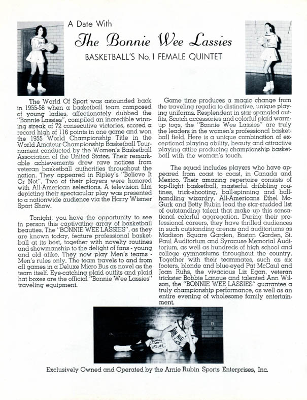They played in the Hancock gym in 1959 against HCS faculty members consisting of Bill Fox, Mal Biedekapp, Van Tocket, Mr. Penitcost, and other teachers. Arnie Rubin of Brooklyn, NY owned and managed the team. The star player was Betty Rubin, Arnie's wife. Betty, "The Bob Cousey" of women's basketball, died several years ago. Arnie died last month at his Brooklyn home. He also owned, with his son Kerry, the School House on the Brooklyn side of Hancock, where Kerry visits on weekends, and to whom we owe thanks for these pictures.