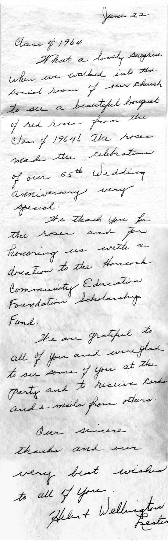 The Class of '64 also made a monetary donation to the Hancock Education Foundation in honor of The Lesters.